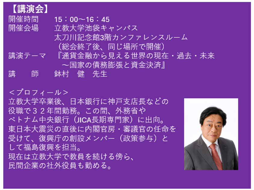 また、会員総会に引き続いて鉢村健先生を講師にお招きしての講演会並びに会員が集う懇親会を開催いたします。ぜひお越しくださいますようお願い申し上げます。
