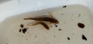 メンバーは日ごろから定期的に行っている市民モニタリングの経験を活かして、救出されたいきものを仕分けし同定する作業を永石先生と共に担当しました。当日は、日本産ドジョウをはじめ、オニヤンマやシオカラトンボのヤゴ、ガムシ、ガガンボ、ヤマアカガエルなど、合計15種類以上の水生生物が確認されました。救出されたいきものの数はいつも以上で、仕分け作業は大忙し。子どもたちは次々と現れるいきものに目を輝かせ我々の元へ運んできてくれ、メンバーもてんてこ舞いで作業を進めました。きれいな水の指標となる「指標生物」とされるガガンボがいたこと、池の水質は70μS/cmと記録されたことによって、ため池は非常に良い水質が保たれていることも分りました。