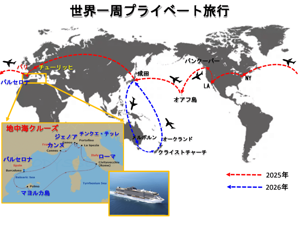 「気をつけて行って来てね!」「写真送ってネ!」「奥さんに宜しくネ!」という温かい激励の言葉。恩師の北山先生をはじめ10期生北山ゼミの仲間からのエールを背に、私は6/21日に妻と一緒に成田からチューリッヒへと夢の世界一周旅行へ旅立ちました。