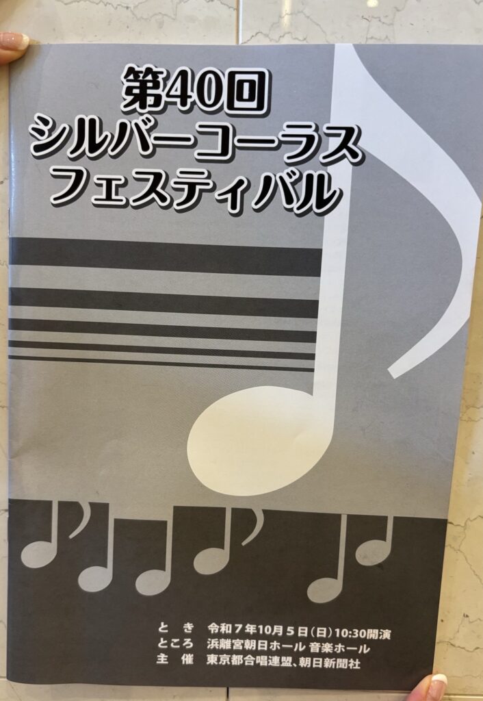 10月5日に東京都合唱連盟、朝日新聞社主催の第40回シルバーコーラスフェスティバルに出演してきました。昨年8月に発足して約1年で初舞台に立てる幸運にワクワクすると共に、歌い切る事が出来るのかという不安もありました。それでも藤沢たまき先生が暖かく楽しく指導してくださり、仲間と共に出演するという心強さもあって、当日を迎えました。歌う曲目は「St.Paul’s will shine tonight 」と「YELL」です。午前中のリハーサルを経ていよいよ本番。会場は浜離宮朝日ホール音楽ホールで、とても響きの良いホールなので、この日一番の演奏を披露する事が出来ました。本番に強いのは、RSSC出身の学生だからでしょうか。演奏後はみんな満足の表情を浮かべていました。