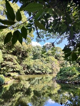 構内にあるフレンチレストラン(椿山荘ホテル直営「カメリア」)でランチをとった後、三四郎池に向かいました。この三四郎池という名は、夏目漱石の小説『三四郎』から名付けられたものだそうで、静寂に包まれた池は、想像していたよりかなり大きく、大きな鯉が優雅に泳いでいて、周りの森も鬱蒼としていて、東京の真ん中にこんな景色を見ることが出来るのかと驚きました。校舎はレンガ造りの時代を感じさせるもので、昔からの建物の外観を残しており(内部だけを改装)、私たちの学生時代を思い起こさせるものでした。最後に安田講堂を見学したら、昭和40年代頃の学生運動の名残と思われる投石の跡が今も残り、タイムスリップしたようでした。