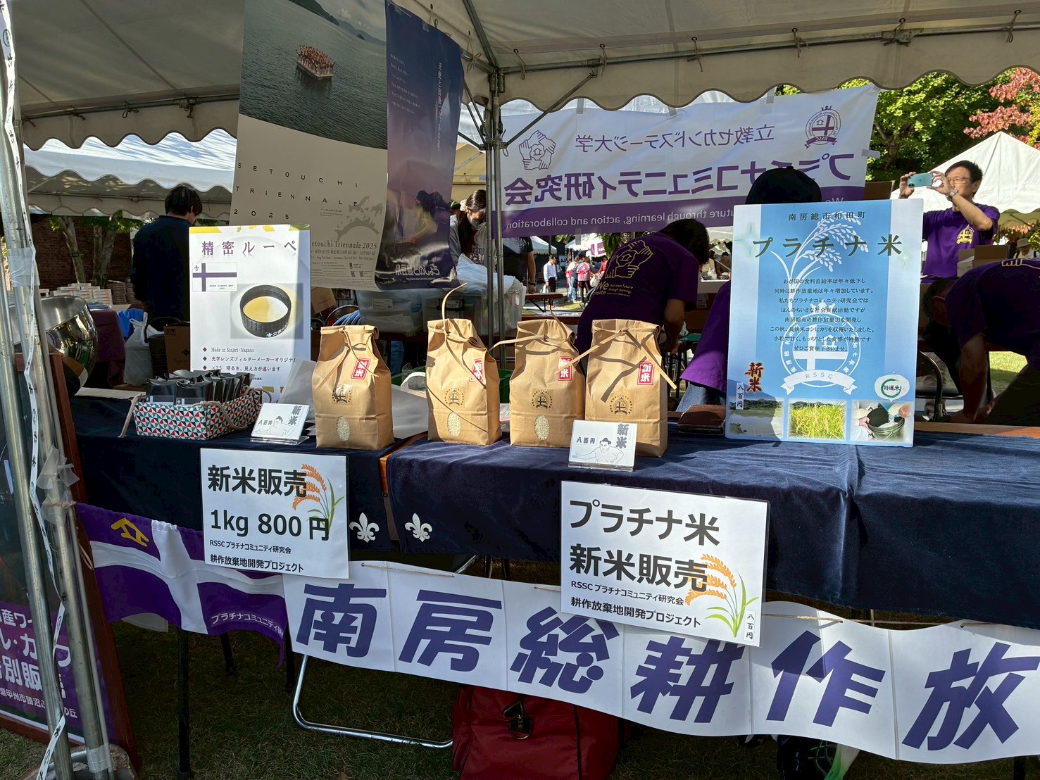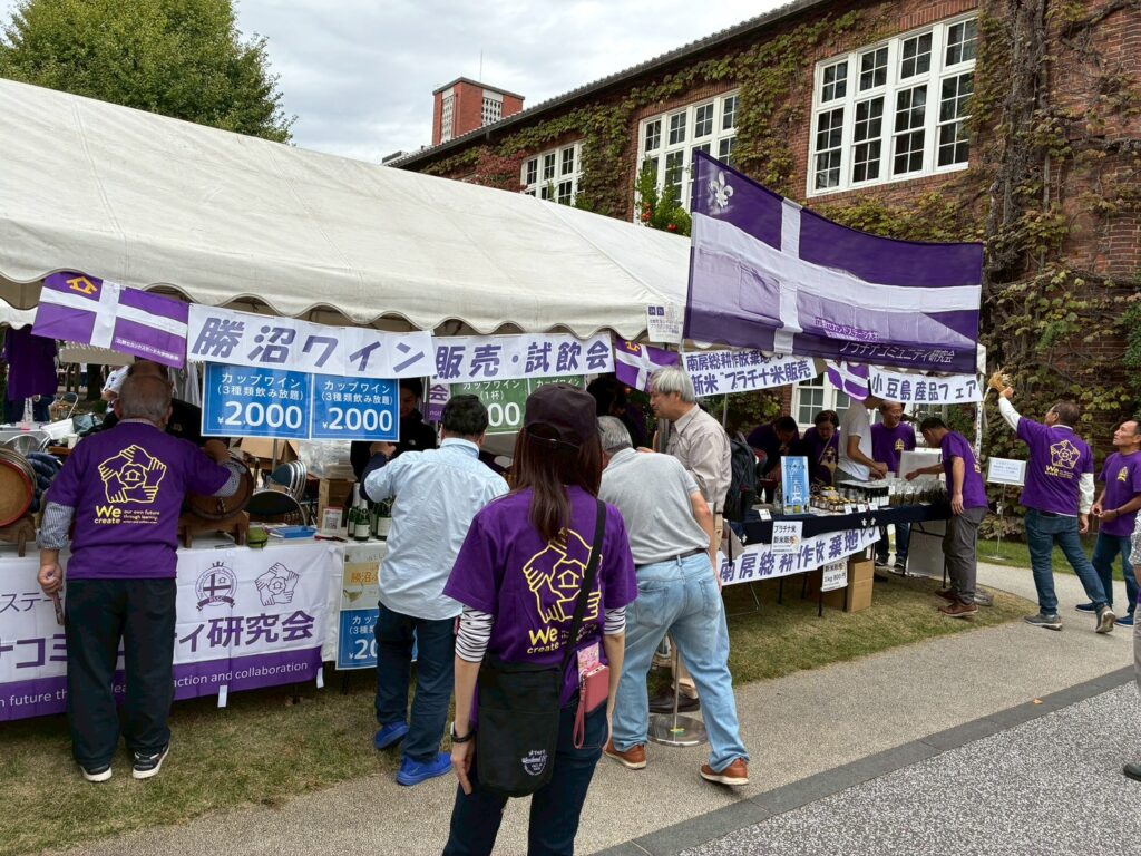 ブースの運営には、10期、14~16期の修了生に加え、17期の現役生も早朝から参加。販売や設営に奔走し、声をからして呼び込みを行う姿が印象的でした。特に、プラチナ研メンバーが収穫・精米に携わった新米が飛ぶように売れていく光景には、手間と愛情を込めた努力が実を結ぶ瞬間でもありました。これはワインやオリーブ製品も閉店間際まで声を枯らして販売した励む姿は、まさに「チーム・プラチナ研」の結束を象徴するものでした。