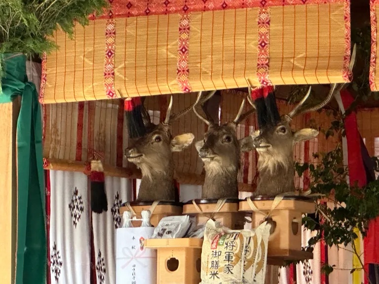 日本にも長野県の諏訪には守屋山という諏訪大社の御神体の山があり毎年4月に御頭祭(右写真)が行われます。御頭祭では御神(おこう)と呼ばれる少年が柱に縛りつけられ神の生贄にされそうになるが、そこに神官が現れ少年を解放し代わりに鹿の頭75頭を板の上に乗せ神に捧げ五穀豊穣を祈ります。昔の日本には山羊がいなかったため鹿になったようで、儀式の内容も山の名前も同じとは不思議な話ですね。