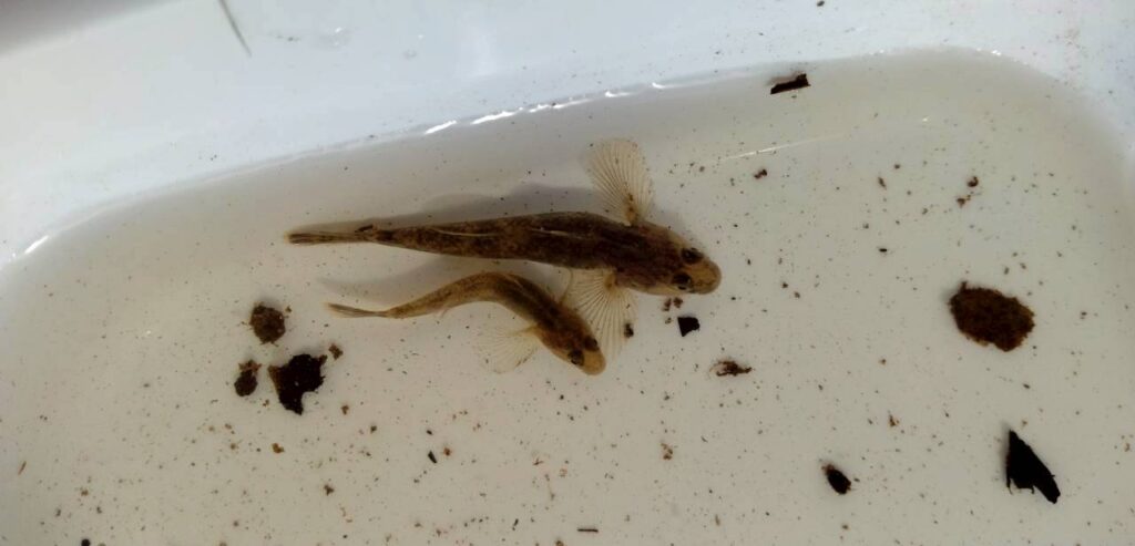 初めに行う水質調査では、水の流れが少ないせいか透明度は若干低かったのですが、電気伝導度 50µS/cm を記録。湧水レベルの数値で良い水質が保たれていることを確認しました。生物調査では、コシアキトンボ・ヤマサナエ・シオカラトンボのヤゴ、カワニナ、カワヨシノボリ、シマアメンボ、ヌカエビ、シナヌマエビ、アメリカザリガニが確認されました。在来のヌカエビが多く見られましたが、依然として外来のシナヌマエビの方が優占しており、今後も注意を払う必要性が示されました。