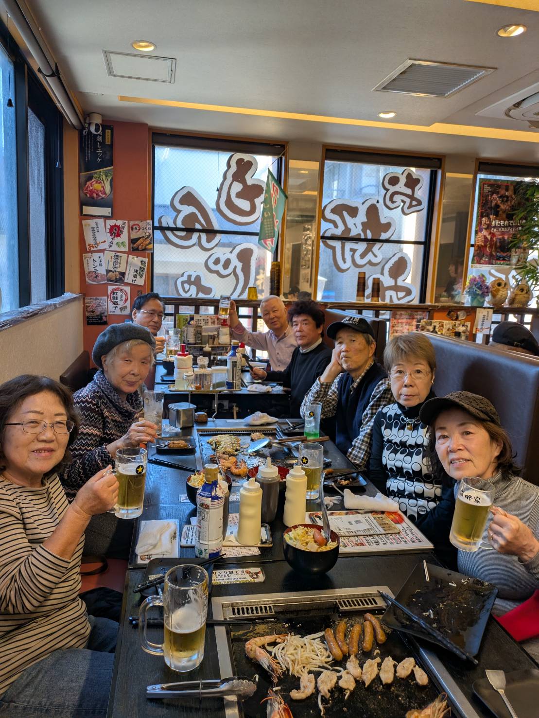 歩き疲れた頃、本日の昼食処お好み焼き・もんじゃの『香味家』に到着、店内は静岡県から修学旅行で来たという小学生で大賑わい。早速慣れない手つきでもんじゃを作ります。出来上がるまでビールで乾杯!!疲れた身体に染みわたります。隣の小学生たちも初めてのもんじゃに四苦八苦、先生方ももんじゃの指導に大忙し。