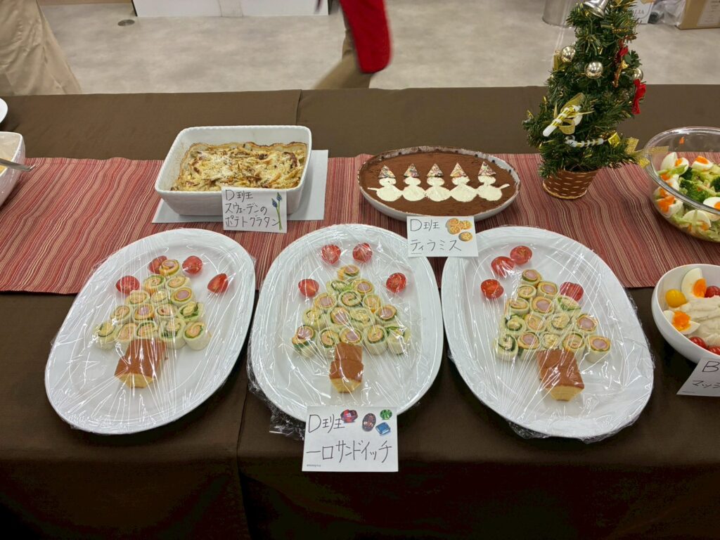 「見栄え」の点では、サンドイッチでクリスマスツリーを形取り、ティラミスに浮き出たスノーマンにホワイトチョコで作った帽子を被せて、クリスマスを演出。