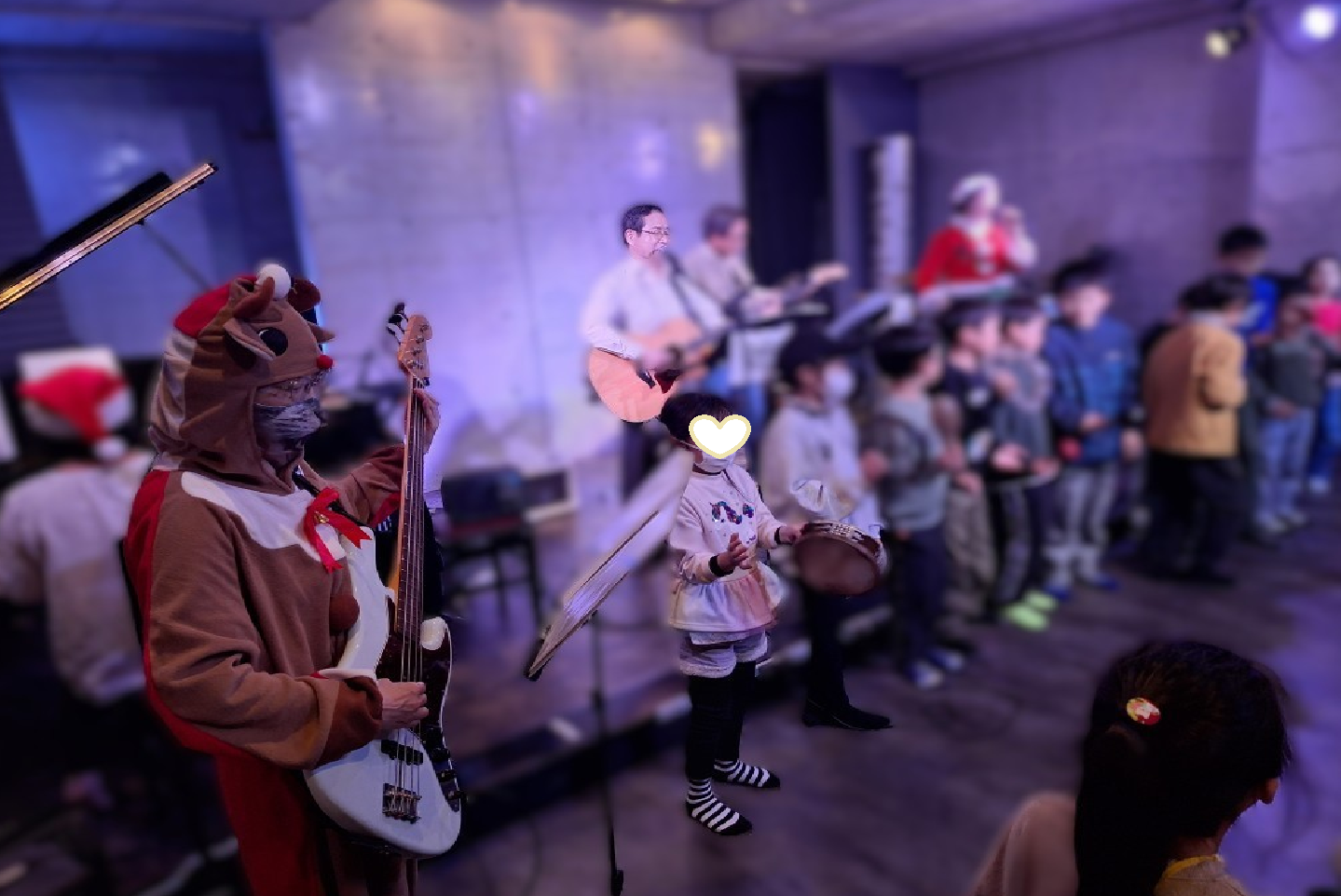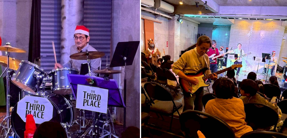 また最後は小学生が学校で習っている『ビリーブ』と『あわてんぼうのサンタクロース』を演奏し、ステージの近くに集まって大いに盛り上がりました。演奏修了後に子どもたちから、『ドラムをやってみたい』『ギターがかっこいい』などの声をかけられたことで、今回のイベントの目的を無事に達成したことを実感しました。