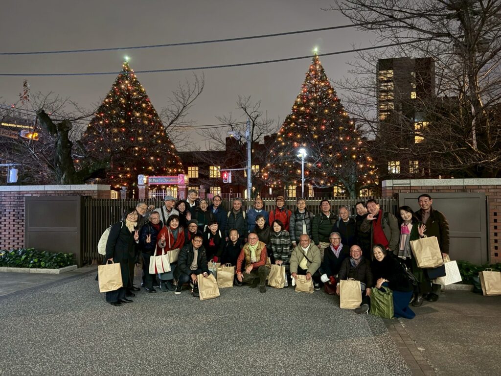 参加者はリース作り終了後、立教大学池袋キャンパスに移動し、クリスマスツリーを背景に参加メンバー同士での写真撮影などを行い、懇親会場である5号館地下のレストランアイビーに向かいました。