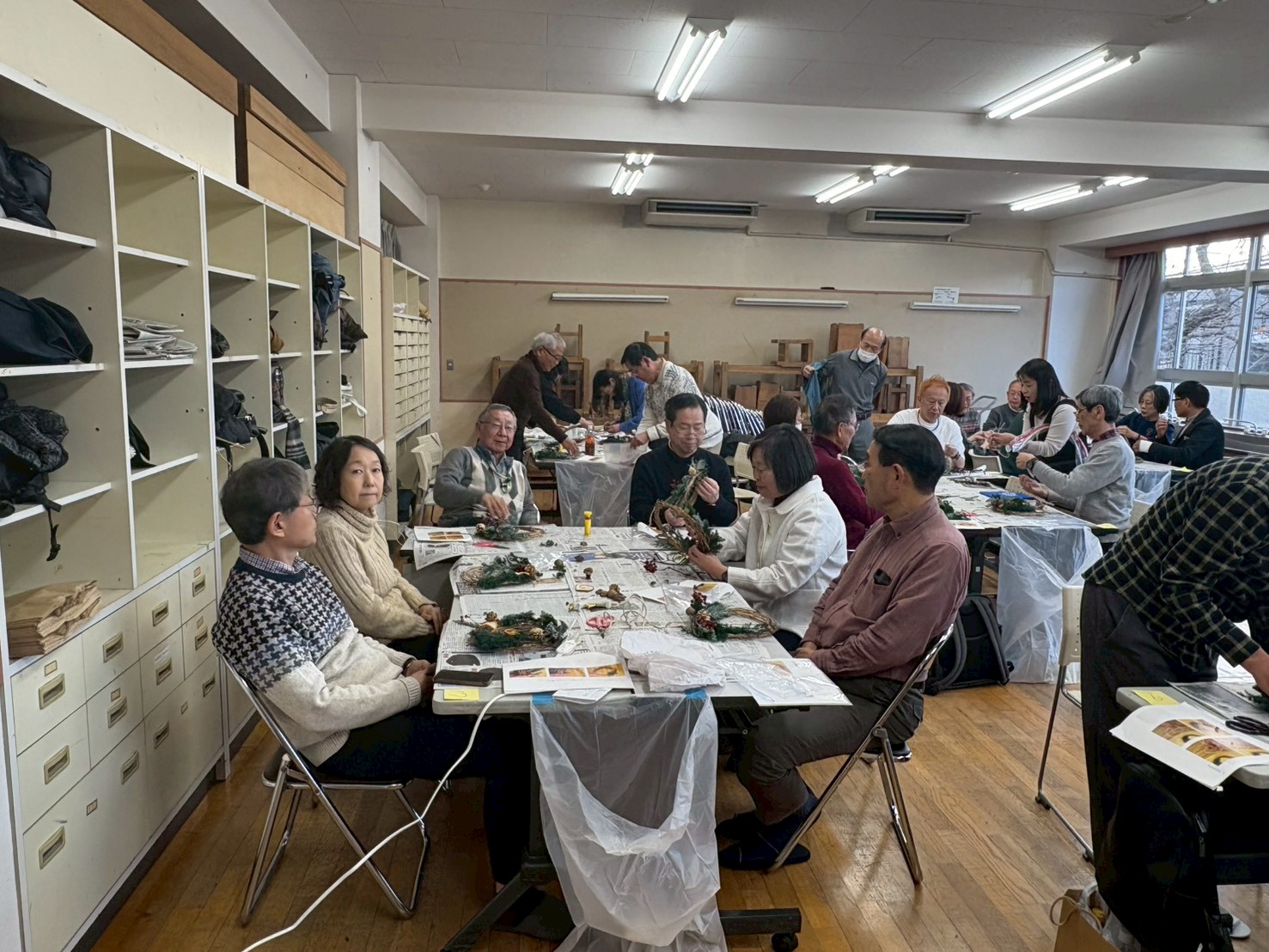 リース作り会場は、池袋キャンパス近くの元小学校校舎である「みらい館大明」の元教室を利用しました。作業前には、今回のワークショップ開催に奔走していただいた幹事の山田さんおよび山田さんの奥様から、リースの作り方を一通り分かりやすくレクチャーしていただきました。またグループメンバーの構成については、新たな交流が生まれるように同じゼミ生をあえて別にして、1グループ4~6人の計6グループに分かれて、それぞれの作業テーブルを囲みました。