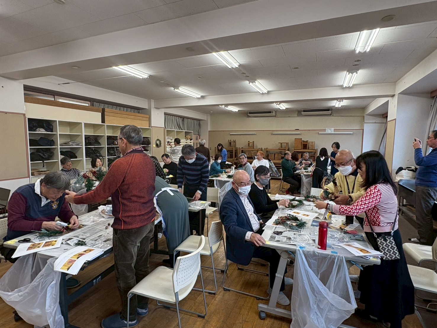リース作りが始まると、参加者の皆さんは童心に帰ったかのように、黙々と、あるいはワイワイと賑やかに、思い思いの作品作りに没頭していきました。イベントの最後には、個人・グループ別の優秀作品投票が控えていることもあり、参加者の皆さんは一段と対抗意識に火が付き、それぞれの個性が光る見事な作品を作り上げていきました。やがて、リースが完成するにつれて、お互いの作品を鑑賞しながら語り合い、記念撮影を撮り合いました。ほどなく、参加者全員による優秀作品の投票が締め切られ、大盛況のうちに、クリスマスリース作りワークショップのイベントを終えることができました。