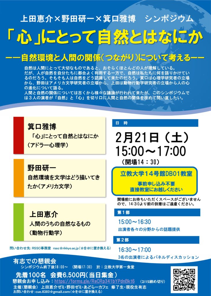 2025年度末で上田恵介先生、野田研一先生、箕口雅博先生が立教セカンドステージ大学を定年退職されます。 2月21日に3先生によるシンポジウム『「心」にとって自然とはなにか ――自然環境と人間の関係(つながり)について考える――』が開催されます。このシンポジウムは修了生にも公開されますので、以下の通りご案内いたします。シンポジウムへの参加については申込不要ですが、その後の懇親会は先着順で申込制になりますのでご留意ください。