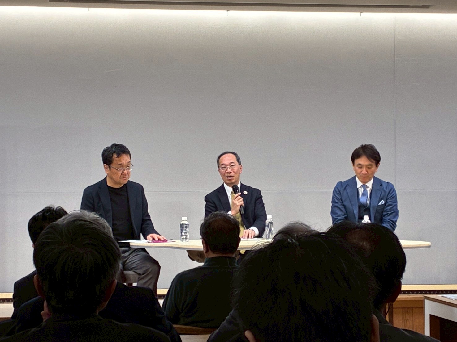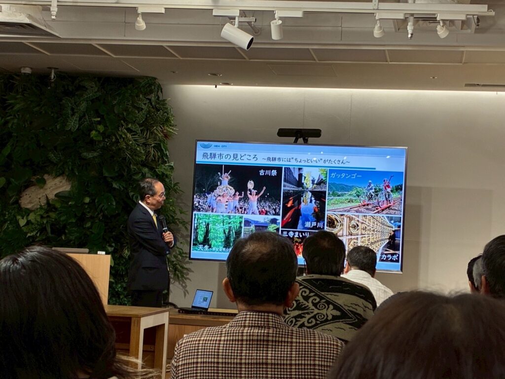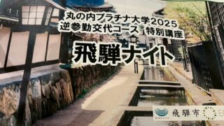 2月2日(火)プラコミ研顧問の松田先生が副学長をつとめられている丸の内プラチナ大学の特別講座「飛騨ナイト」にメンバー有志が参加しました。当日は、地域創生に興味を持つ60名ほどの社会人が参加し、飛騨市の魅力と地域の取り組みについて深く知ることができました。都竹市長のお話はとても熱意にあふれており、自然・文化・研究・食といった飛騨市の多彩な魅力が丁寧に紹介され、飛騨地方への興味が一層高まりました。特に印象的だったのは、人口減少や高齢化といった課題に対し、飛騨市が積極的に取り組んでいる「飛騨市ファンクラブ」や「ヒダスケ!」などの関係人口づくりの施策です。地域外の人とつながりながら未来をつくろうとする姿勢に強く共感し、その場でファンクラブに入会したメンバーもおり、来年度に予定されている「逆参勤交代」の取り組みについても、市長から期待と可能性が語られ、都市と地域が協力し合う新しい関わり方のイメージが広がりました。