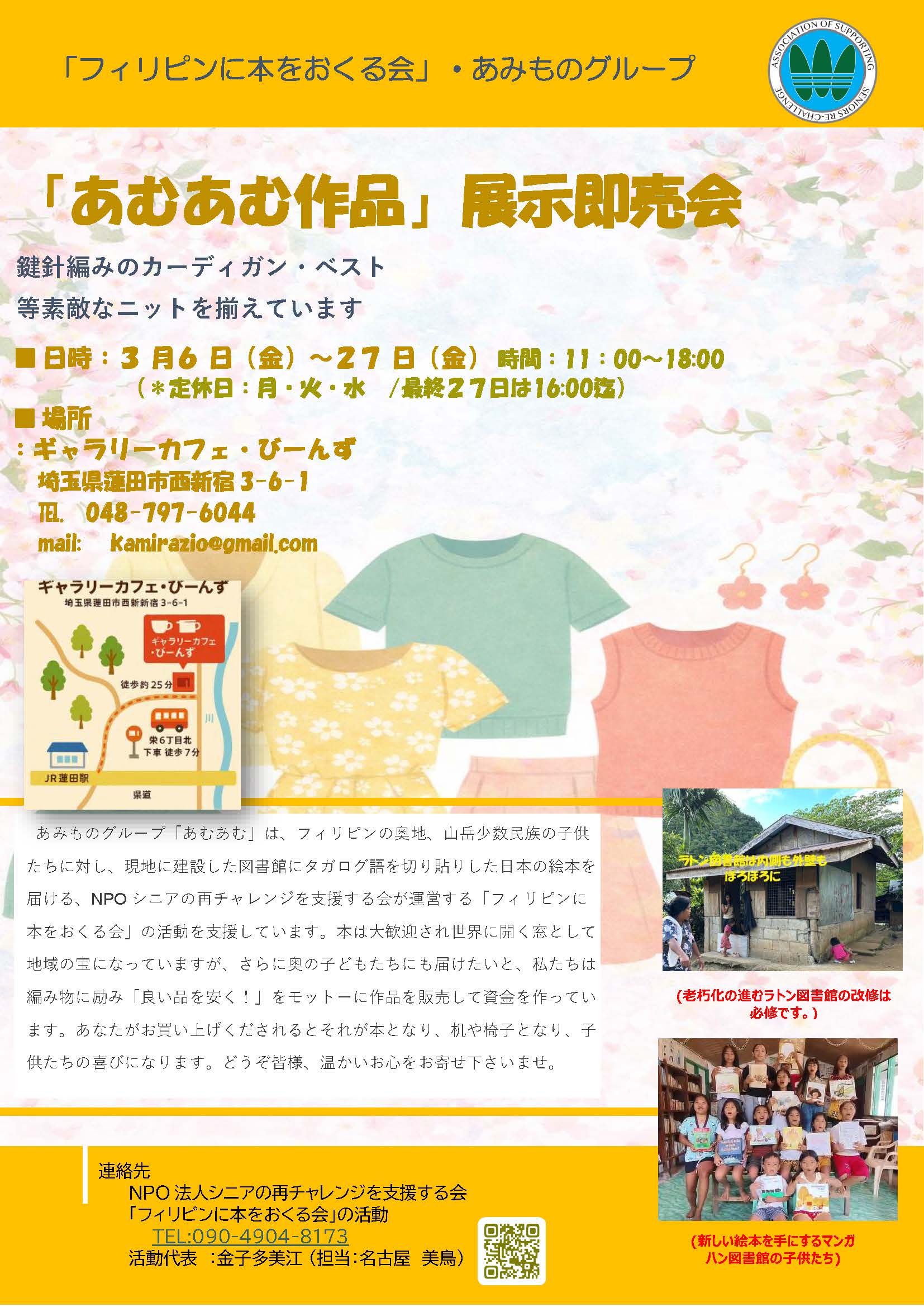 さいちゃれでは、従来より、「フィリピンに本をおくる会の活動」を資金面で援助する、あみものグループ「あむあむ」の作品展示販売会を開催していますが、会場のご支援を頂き蓮田(ギャラリーカフェ・びーんず)での販売会を開催をいたします。期間は3月6日(金)~3月27日(金)です。皆様にお買い上げいただく収益は、フィリピン山岳地帯の子供たちにタガログ語に翻訳した絵本を届ける資金として活用いたします。 多くの皆様のご来場、お待ちいたします。