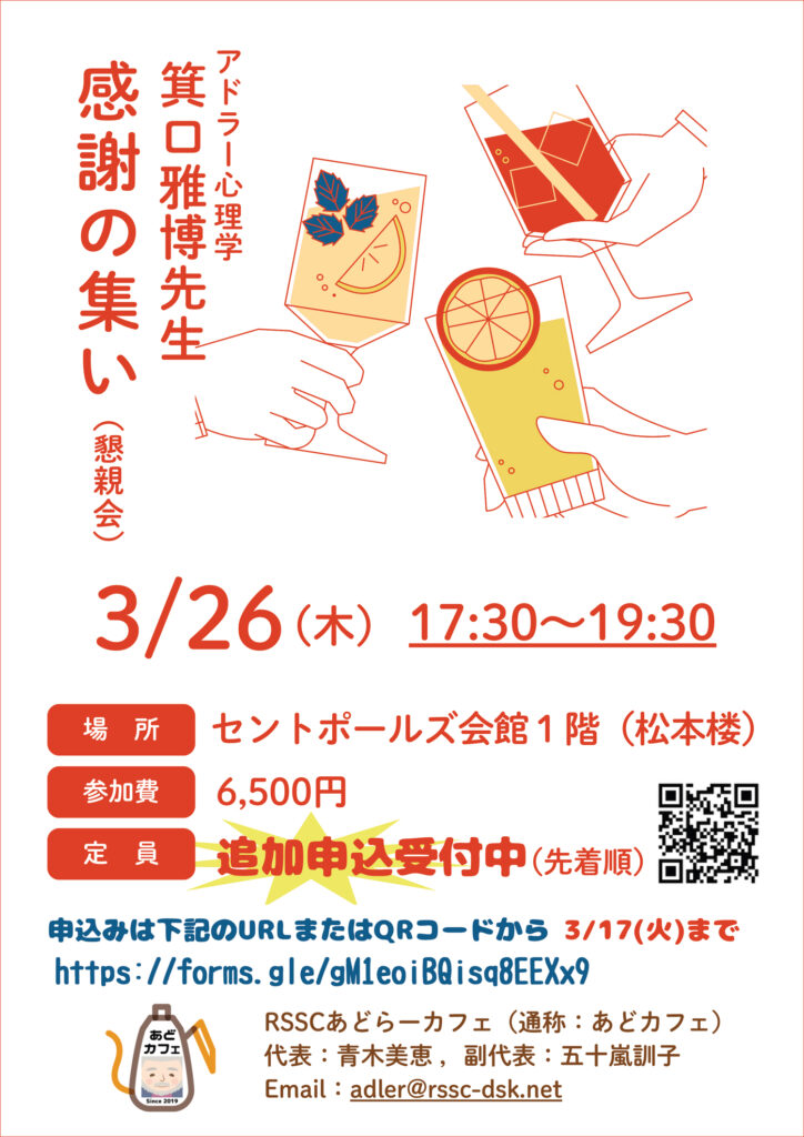 先日、ご案内しました[箕口雅博先生の最終講義]について、追加情報があります。同日の懇親会は、同好会「RSSCあどらーカフェ」にてご案内しておりますが、同好会以外の方にも参加が可能となりました。下記の申込み方法にて、受け付けますので、どうぞよろしくお願い致します。
