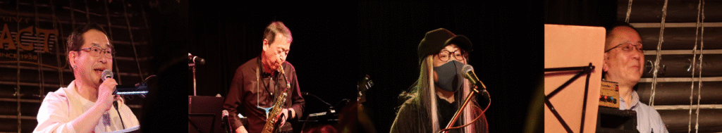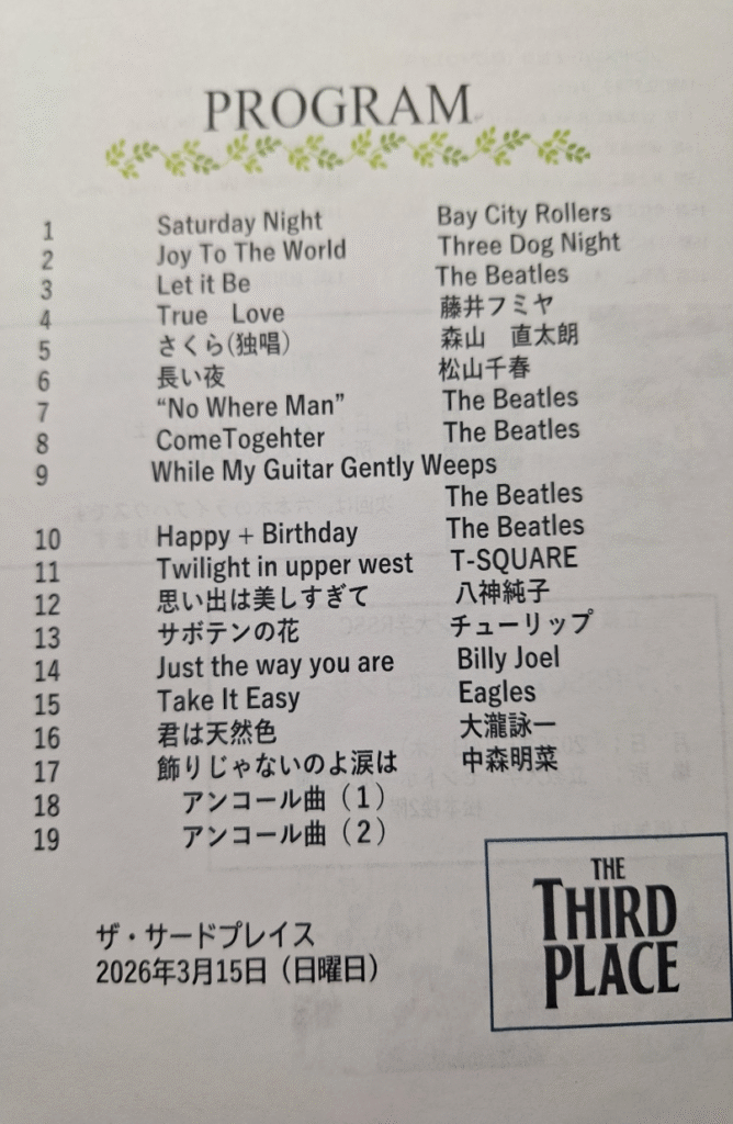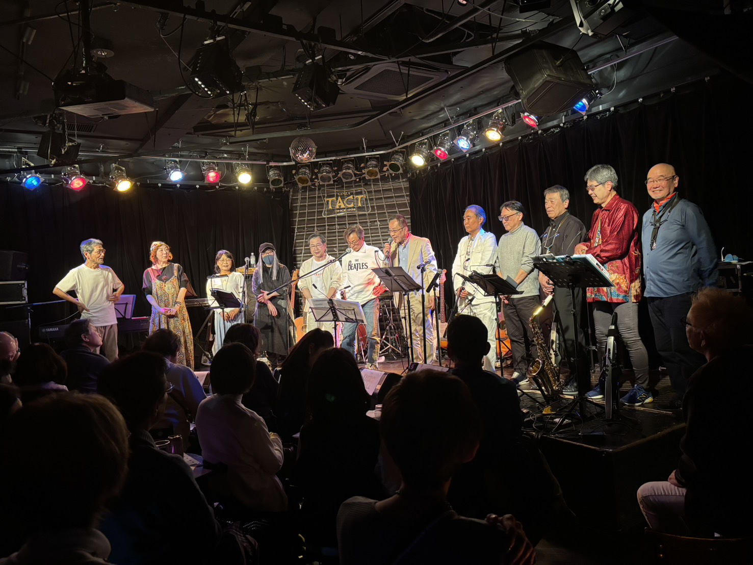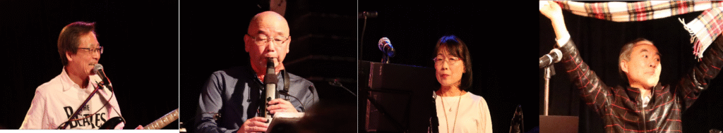 “僕らの時代Vol.6”のタイトルが示す通り、メンバー及び参加者の若かりし頃に親しんだ、1960年代から1980年代の曲を中心にアンコールも含め全19曲を演奏いたしました。