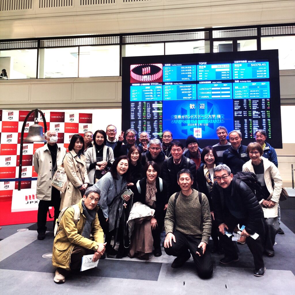 10時からは東証の動画でその歴史や機能について約20分鑑賞した後、専門スタッフの案内で回廊を歩きながら、テレビでも映し出される円形のグルグル回る株式相場表示装置(通称チェッカー)の前では、参加者から感嘆の声が上がる。かつての指の動きによる場立ちサインの説明を受けたり、旧取引フロアでは「歓迎 立教セカンドステージ大学様」との表示に迎えられ、一同の表情も和らいだ。記念撮影では、どこか学生時代に戻ったような笑顔が印象的であった。