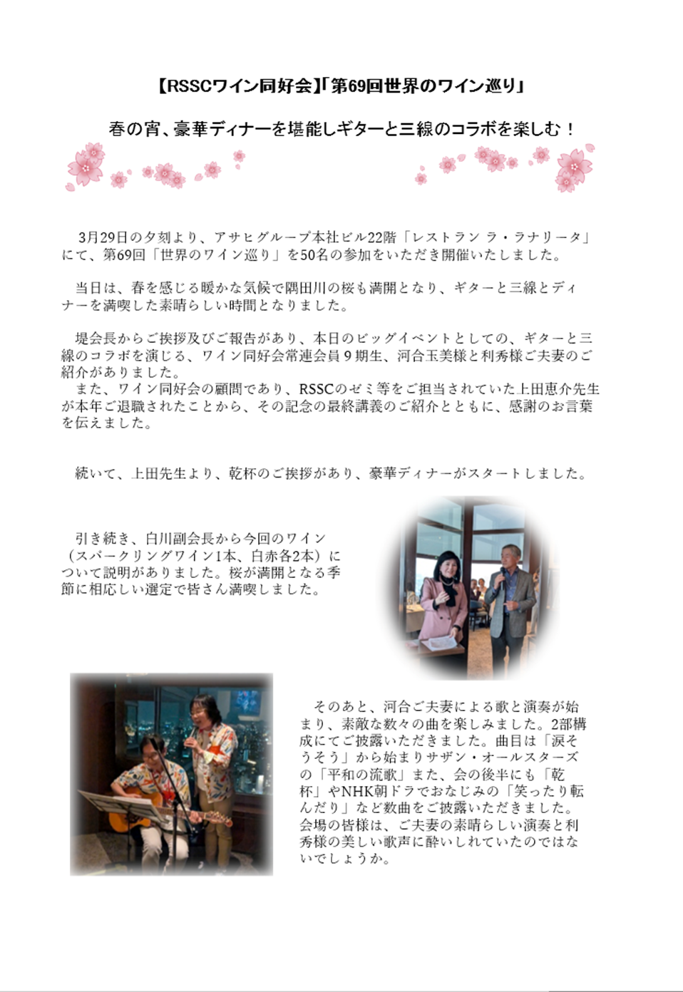 • 同好会・研究会2026年4月2日【RSSCワイン同好会】「第69回世界のワイン巡り」                  春の宵、豪華ディナーを堪能しギターと三線のコラボを楽しむ!